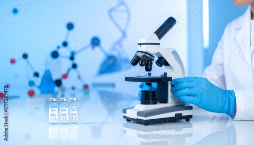 Scientist working with microscope, researching cancer treatment vials