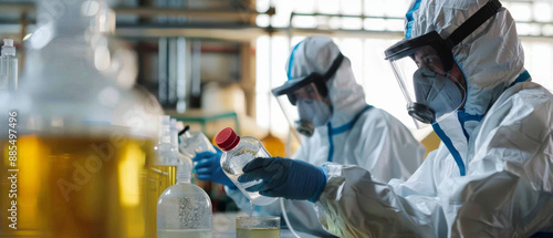 Scientists in full protective suits conduct experiments in a lab, emphasizing the meticulous and high-stakes nature of their research.