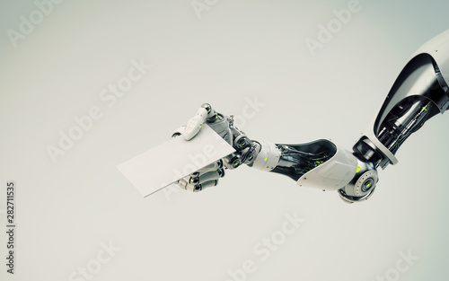 Sci-fi robotic arm showing blank card, 3d rendering