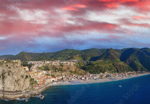 Scilla, Calabria. Famous touristic italian town in summer season, panoramic aerial view