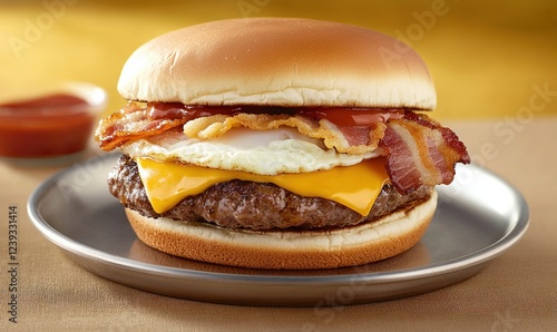 Scrumptious breakfast cheeseburger on a silver plate with mustard