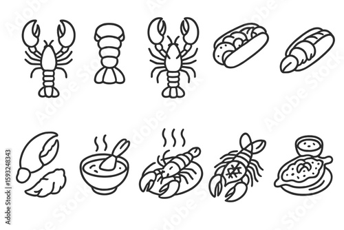 Seafood cuisine outline icon set. lobster, shrimp, and crab meal outline collection