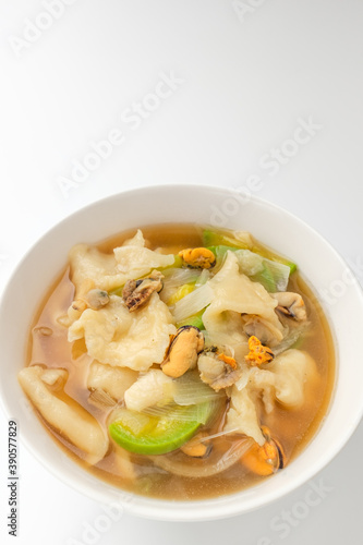 Seafood sujebi on a white background