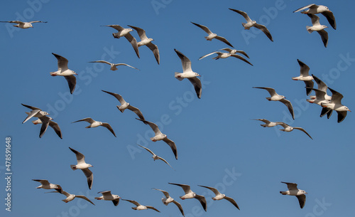 Seagulls flying in the sky over the seaport