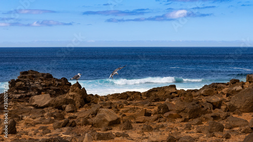 seagulls on a rocky and darkbrown volcanic coast