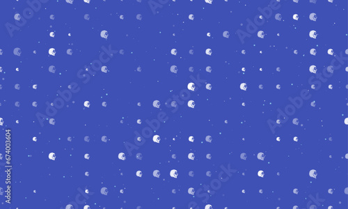 Seamless background pattern of evenly spaced white lion head icons of different sizes and opacity. Vector illustration on indigo background with stars