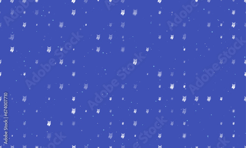 Seamless background pattern of evenly spaced white owl symbols of different sizes and opacity. Vector illustration on indigo background with stars