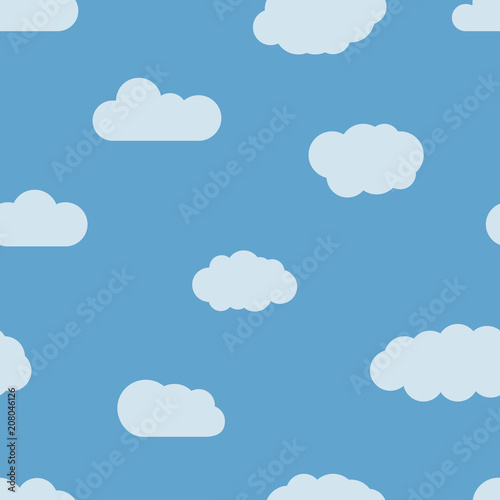 Seamless background with blue sky and white cartoon clouds. Vector illustration.