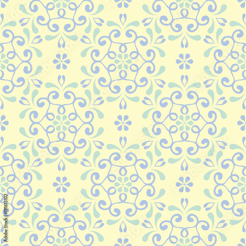 Seamless background with floral pattern. Beige background with light blue and green flower elements