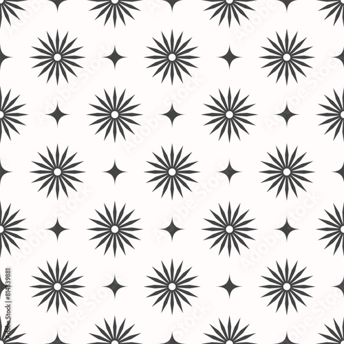 Seamless boho pattern with abctract sun and star. Minimal black illustration on white background. Surface cover design. Fabric textile print.