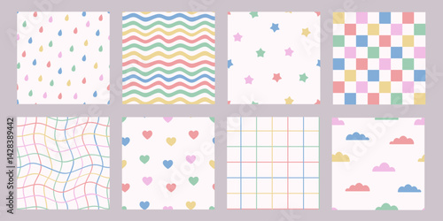 Seamless colorful patterns set with stripes, cells, hearts, stars, drops, waves, clouds. Cute backgrounds for kids or fabric. Funky hippie fashion textile print, retro background. Vector illustration