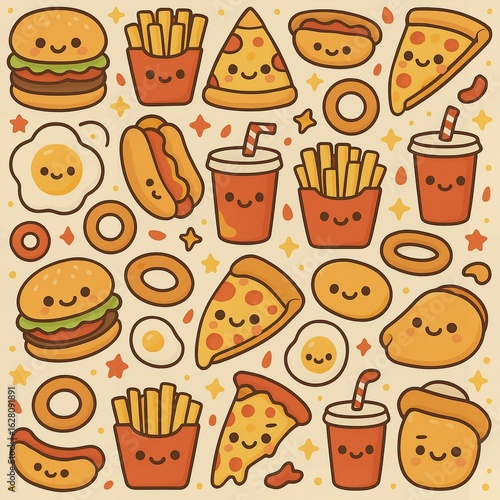 Seamless Cute Savory Food Pattern – Symmetrical Kawaii Fast Food Tile Background