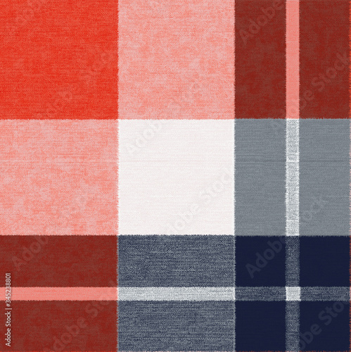 Seamless fabric texture print.Plaid check pattern in red, beige, white, dusty blue and black.