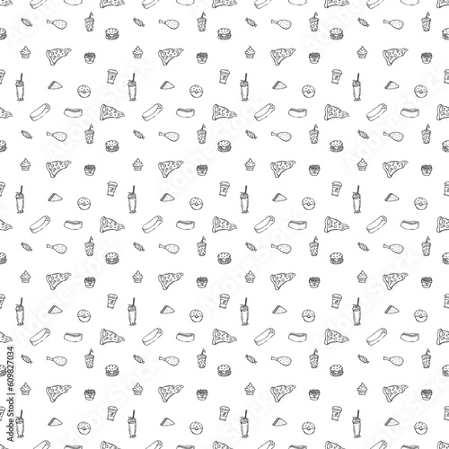 Seamless fast food pattern. fast food background. Doodle fastfood icons. Drawn food pattern