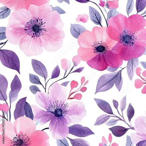 Seamless floral pattern, watercolor style, delicate blossoms, pink and purple flowers, white background, design element, print