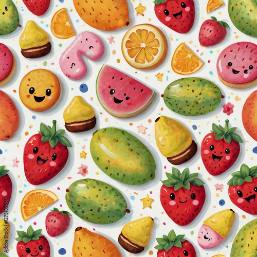 Seamless fruit design featuring oranges and smiling strawberries.