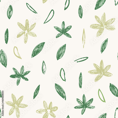 Seamless Hand-Drawn Floral and Leaf Pattern in Crayon Style