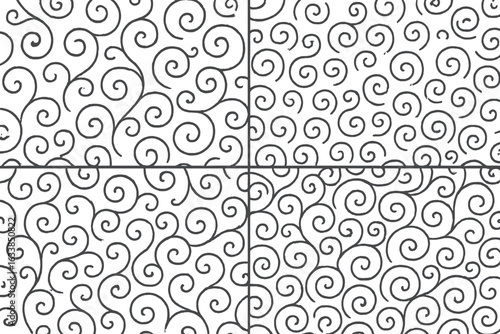 Seamless hand-drawn swirl and curl pattern set, collection of 4 vector flourish backgrounds, decorative doodle ornate spirals, tileable black line art on white, endless wrapping surface design