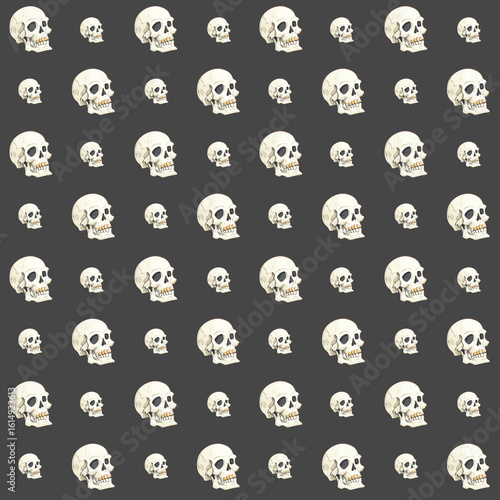 Seamless horror pattern featuring ivory human skulls on charcoal black background for gothic apparel and dark décor prints