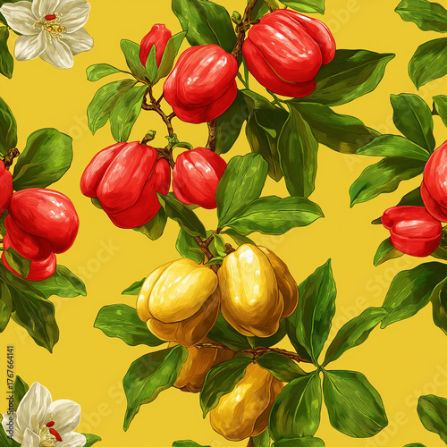 Seamless pattern Ackee. Exotic tropical fruit native to West Africa and Jamaica. For food packaging, Caribbean-themed projects, restaurant menus, educational materials, posters, textile prints.