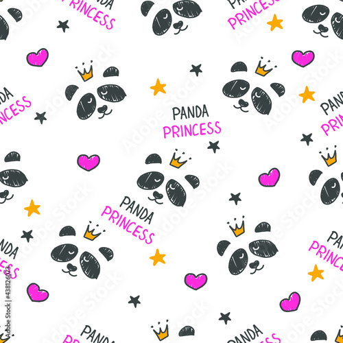 Seamless pattern hand-Drawn faces of pandas, stars and heart. Background for Children's clothing. Panda Princess pattern.