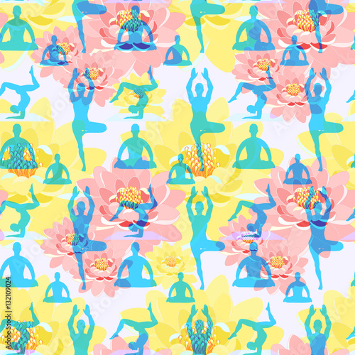 seamless pattern man standing, exercise, meditation, lotus.