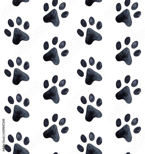 Seamless pattern of animal paw footprint. Hand drawn water color graphic painting on white. Cosy monochrome backdrop for design decoration, web site, banner, poster, fabric, scrapbook paper, card.