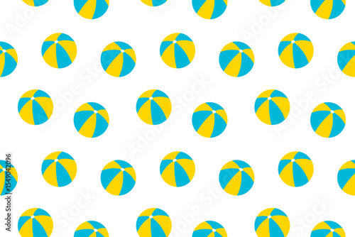 Seamless pattern of blue and yellow beach balls on a clean white background, perfect for fun summer projects.