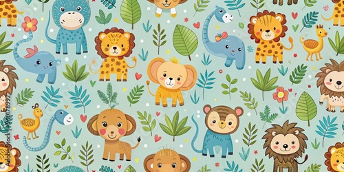 Seamless pattern of cute animals including elephants, giraffes, lions, and monkeys