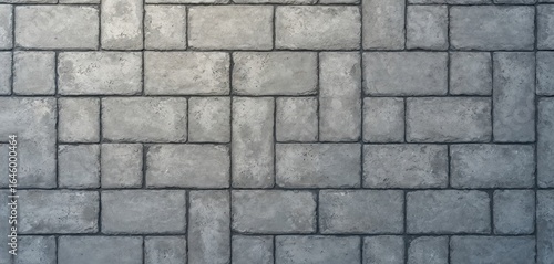 Seamless pattern of gray paver bricks in flat lay background. Rectangular textured tiles form repeating geometric shape, suggesting sidewalk patio construction. Ideal for architectural design,