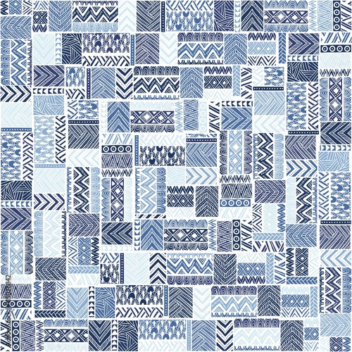 Seamless pattern of patchwork. Elegant blue ornament. Tribal and