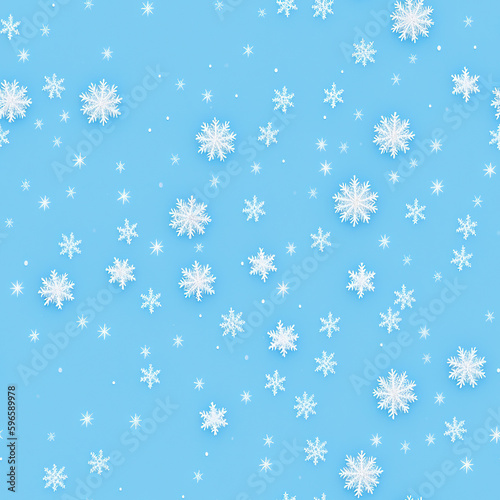Seamless pattern of snowflakes on blue background. Winter snow texture. Generative AI.