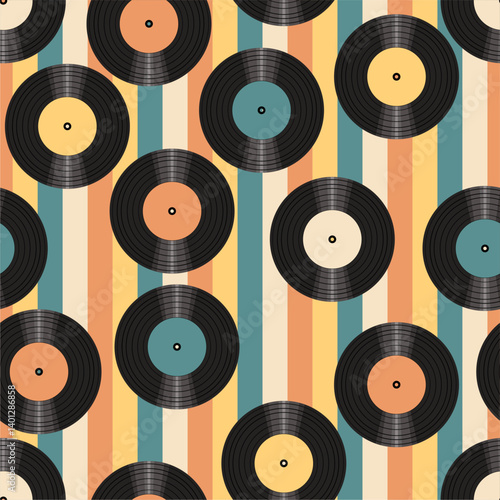 Seamless pattern print wallpaper with vinyl record discs music illustration vector retro style 60s, 70s, 80s, design art background for paper, textile, pack etc.
