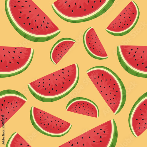 Seamless pattern vector illustration of watermelon fruit in orange background.