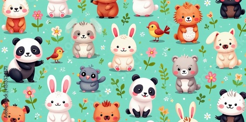 Seamless pattern with adorable cartoon animals like pandas, bunnies, and birds, bunnies, seamless