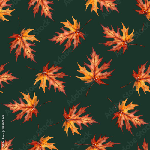 Seamless pattern with autumn leaves. Watercolor illustration on green background