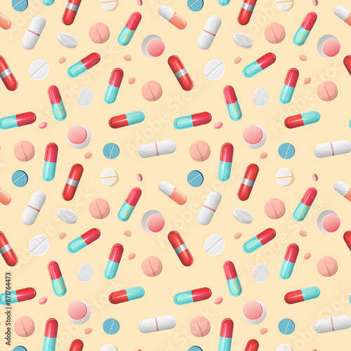 Seamless pattern with colored tablets, capsules and pills on yellow background.