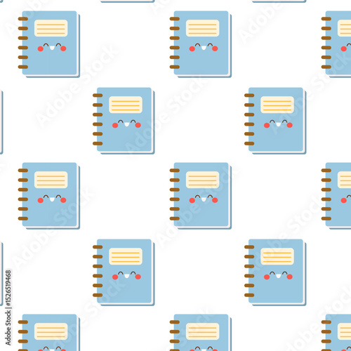 Seamless pattern with cute blue cartoon notebooks smiling on white background. Perfect for school supplies, kids' decor, and educational stationery designs.
