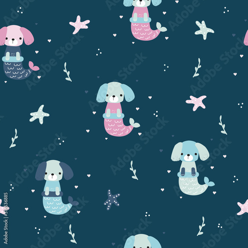 Seamless pattern with dog mermaid. Cute underwater print. Vector hand drawn illustration.