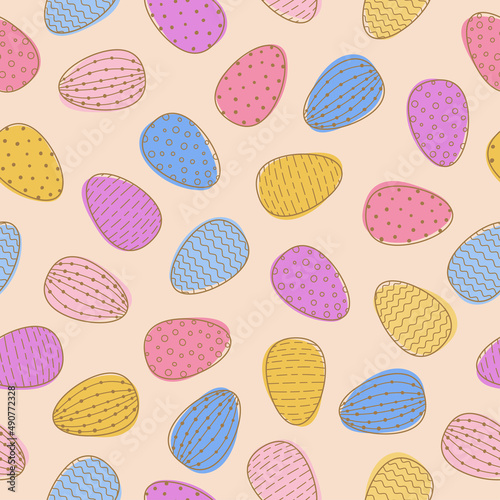 Seamless pattern with Easter decorated eggs. Line art colorful eggs on pink background.