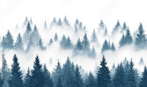 Seamless pattern with foggy spruce forest. Fir trees isolated on white background.