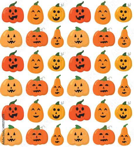 Seamless pattern with halloween carved faces pumpkins. Funny autumn background