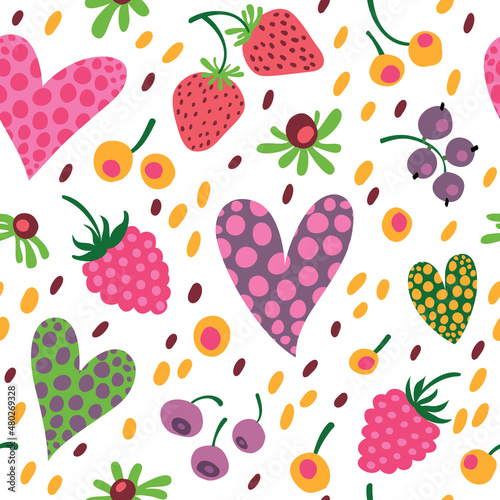 Seamless pattern with hearts, raspberries, strawberries and flowers. Juicy summer style.