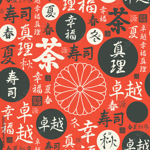 Seamless pattern with Japanese or Chinese hieroglyphs Perfection, Happiness, Truth, Sushi, Tea, Spring, Summer, Autumn, Winter on a red. Decorative vector background Wallpaper, fabric, wrapping paper