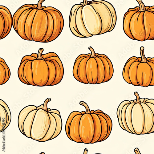 Seamless pattern with orange and cream pumpkins on a light background.