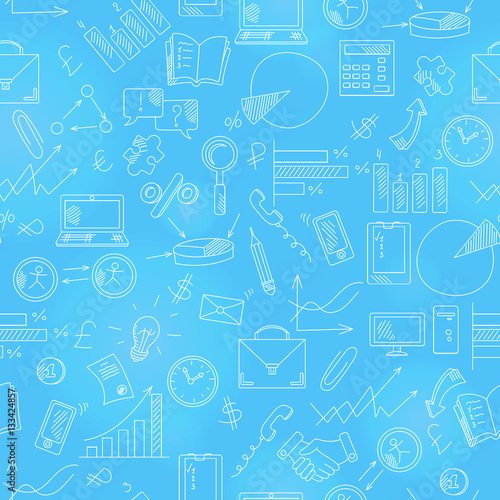 Seamless pattern with simple hand-drawn icons on a theme business, light outline on a blue background. Seamless background on a theme business and earnings