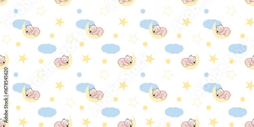 Seamless pattern with sleeping bears, stars, moon and clouds on editable background