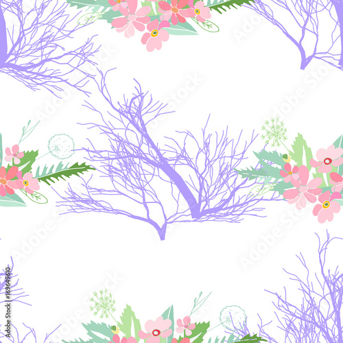 Seamless pattern with summer flowers and leaves on a white background