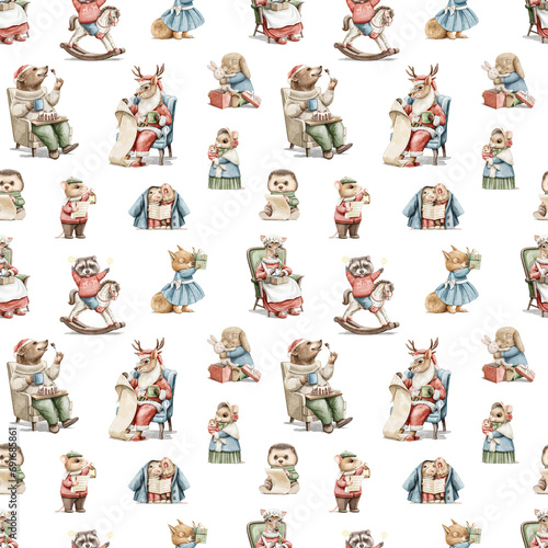 Seamless pattern with vintage variety set of funny cute animals in Christmas clothes isolated on white background. Watercolor hand drawn illustration sketch