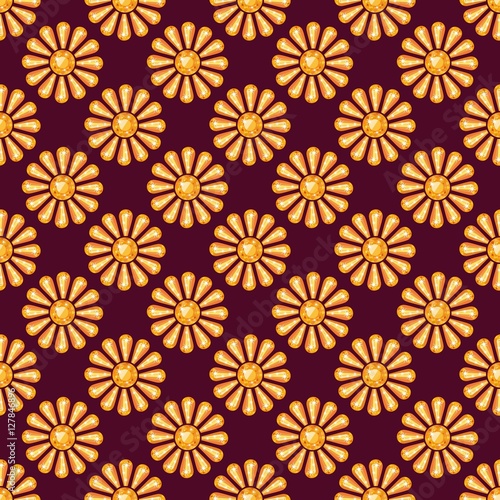 Seamless pattern with yellow precious gem Topaz in shape of shining sun from different cuts on dark claret background